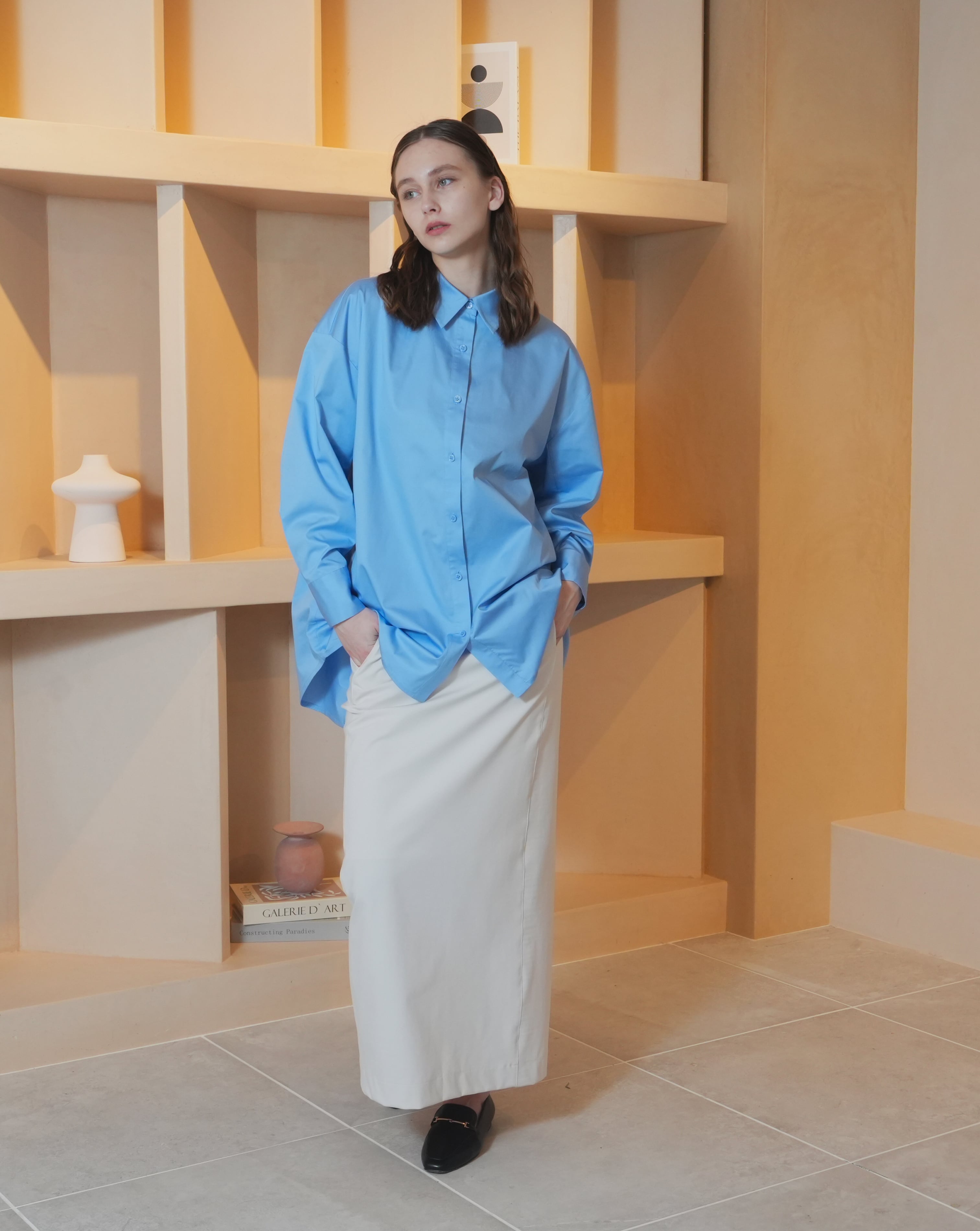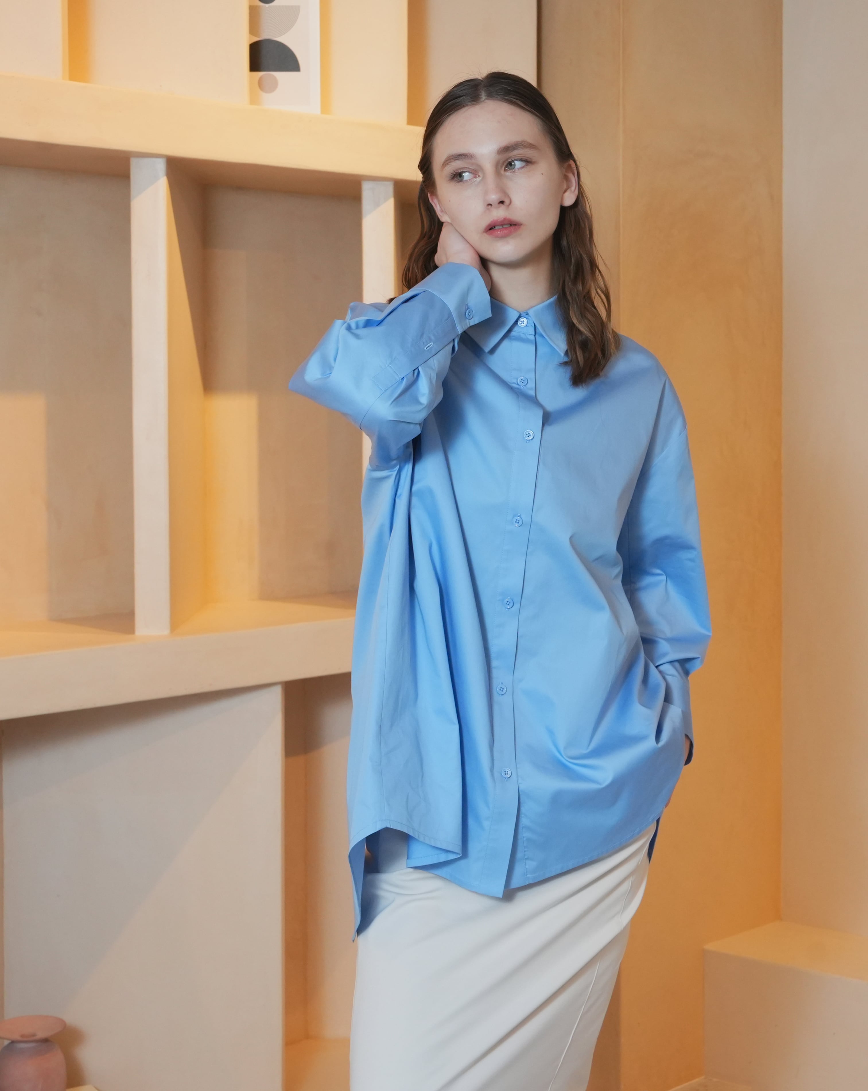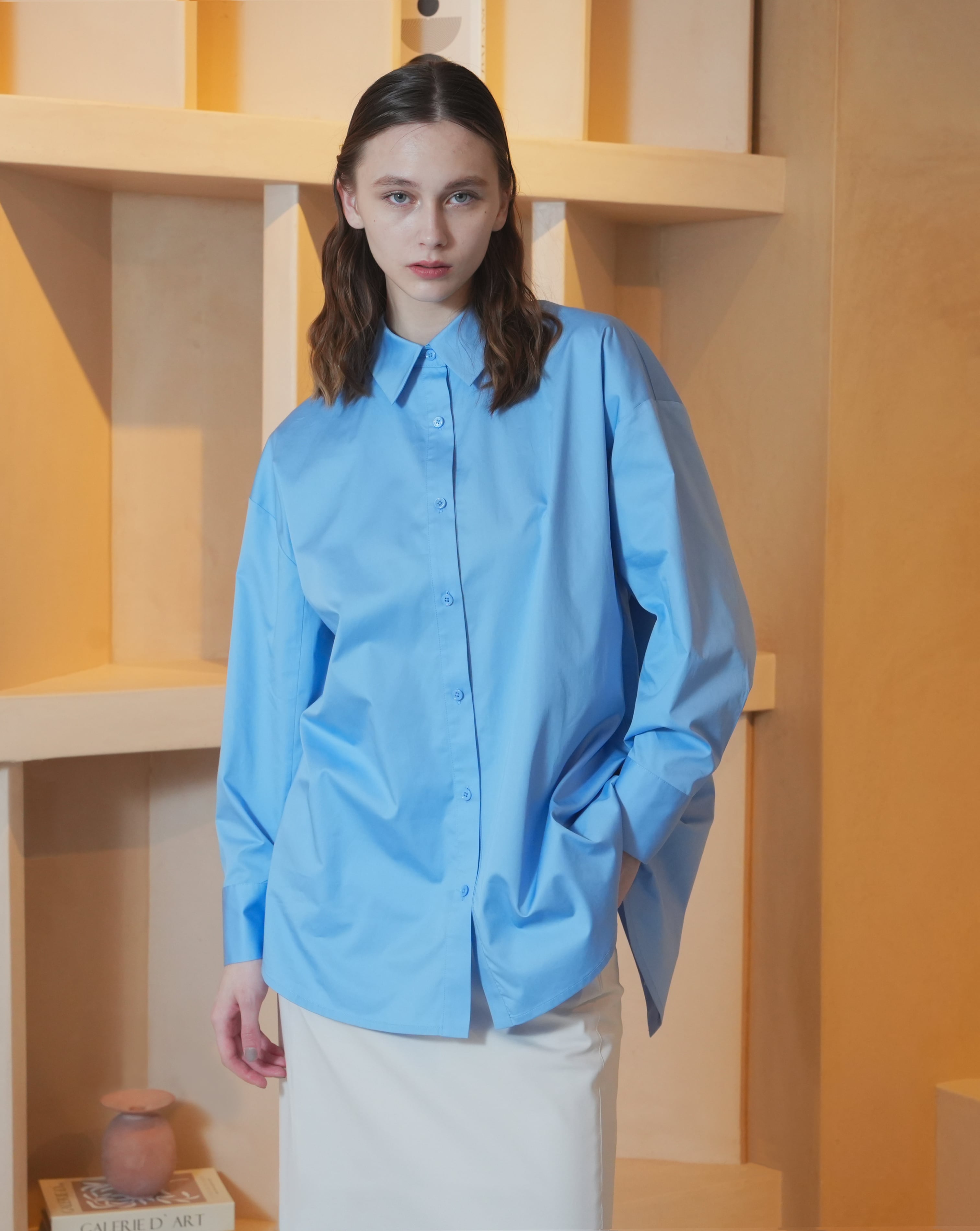 きめ細やかな表面と上品な光沢のある細番手のコットン糸を使用したシャツ地。ゆったりとしたサイズ感と後身頃のスリットで抜け感を演出。袖はワイドとスリムの2種類のシルエットに変形が可能です。