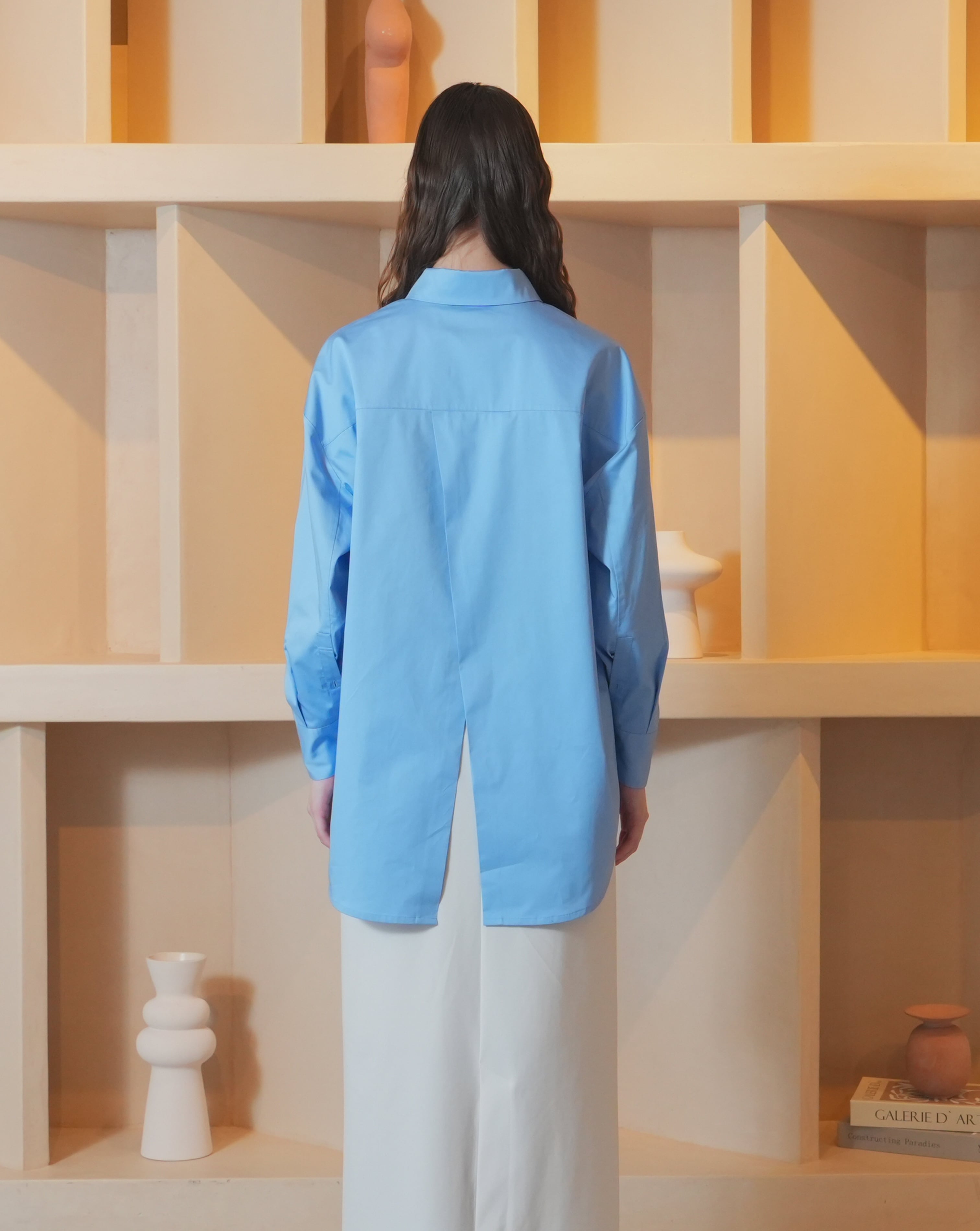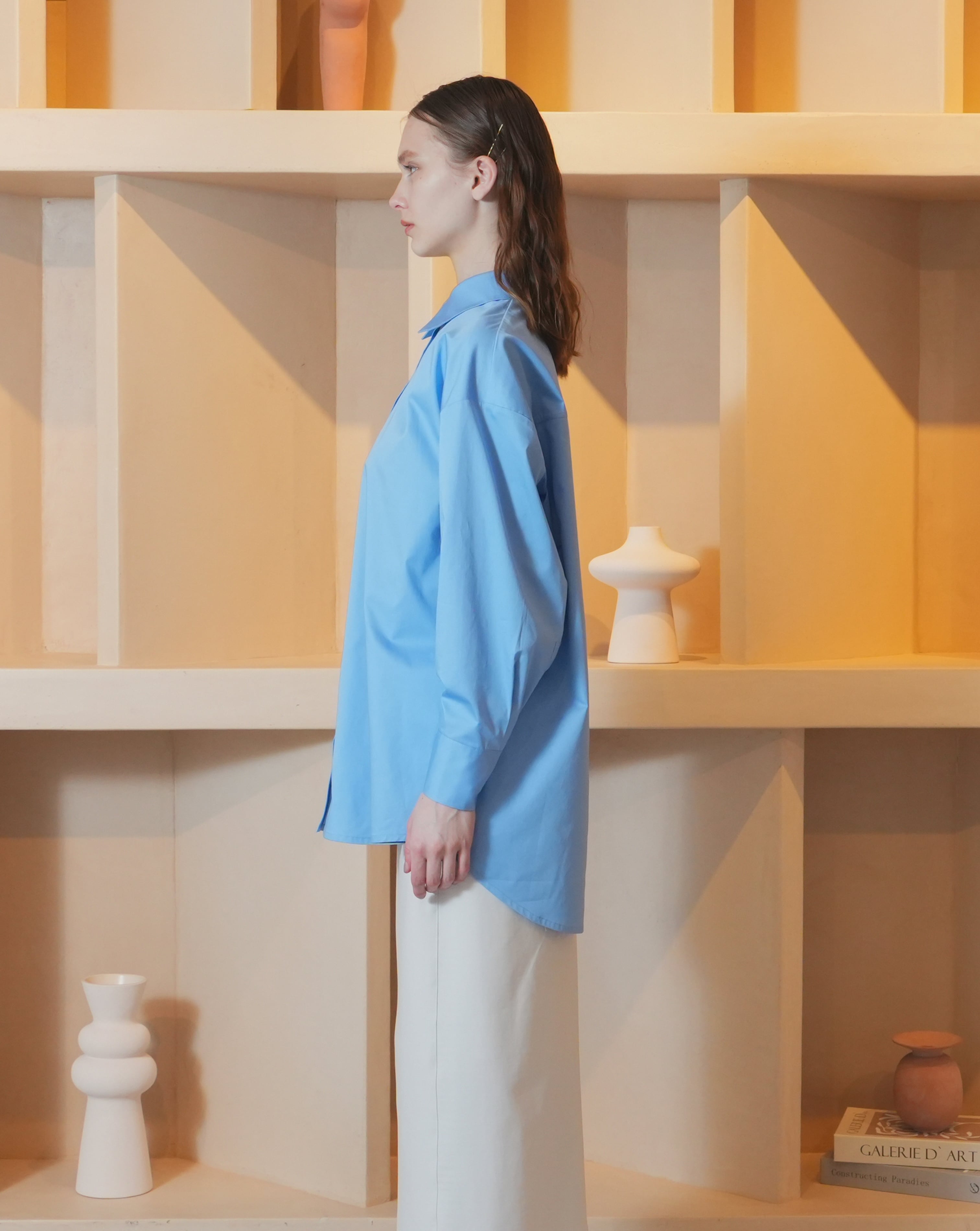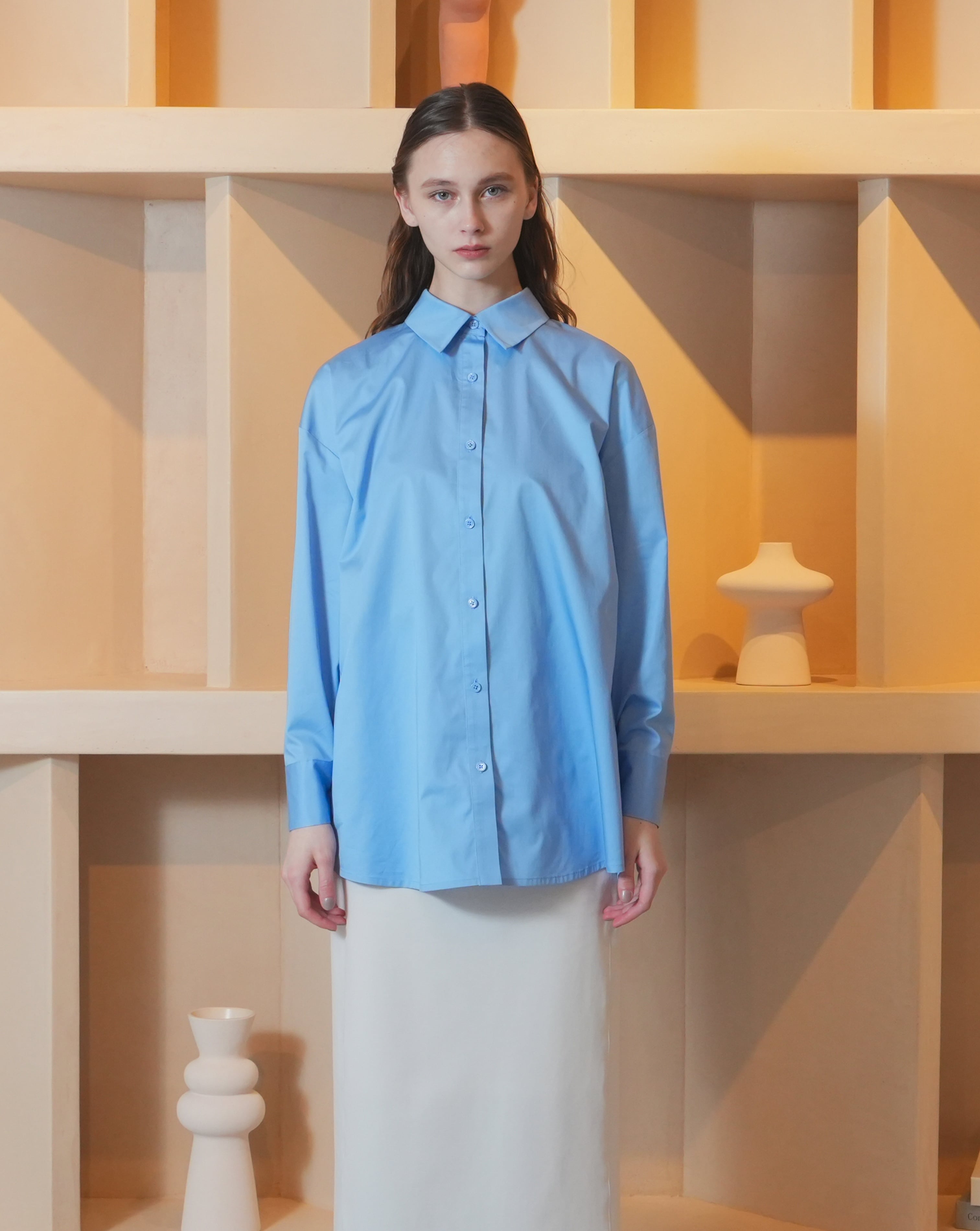 きめ細やかな表面と上品な光沢のある細番手のコットン糸を使用したシャツ地。ゆったりとしたサイズ感と後身頃のスリットで抜け感を演出。袖はワイドとスリムの2種類のシルエットに変形が可能です。