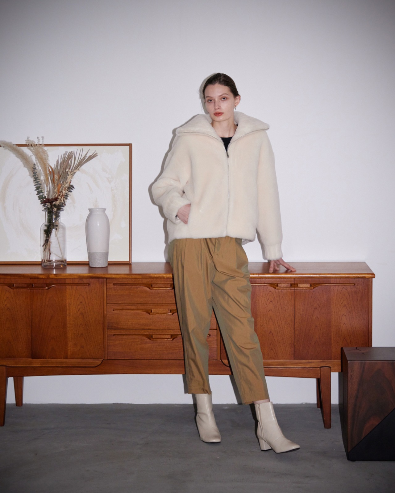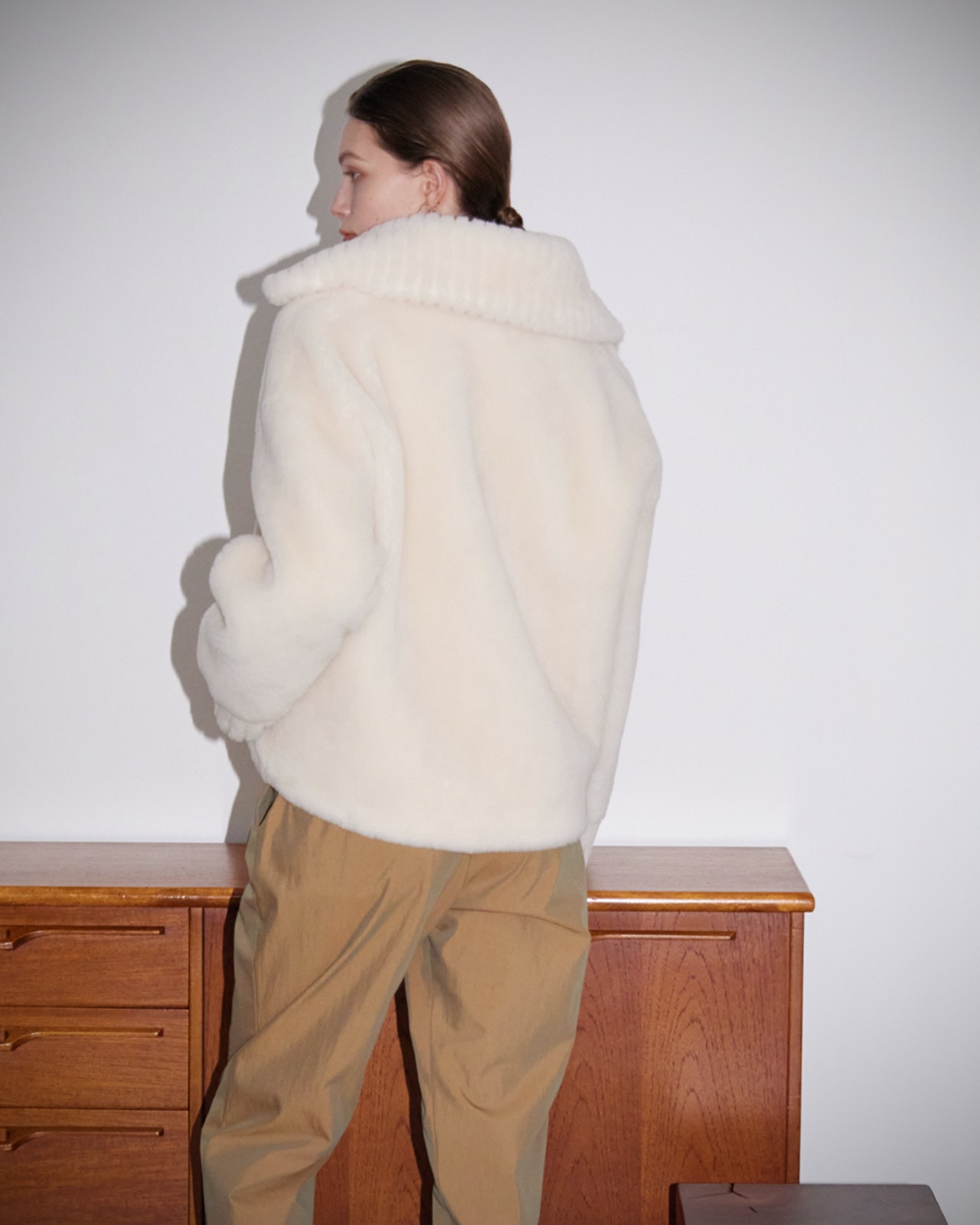 ウォーム感のあるウールボアを使用したセーラーカラーブルゾン。ウール特有の毛並みのきめ細やかさが上品なルックス。毛をカッティングしリブに見立てた襟や袖口がデザインにコントラストを効かせています。重厚感あるルックスに反して軽い着心地が特徴です。