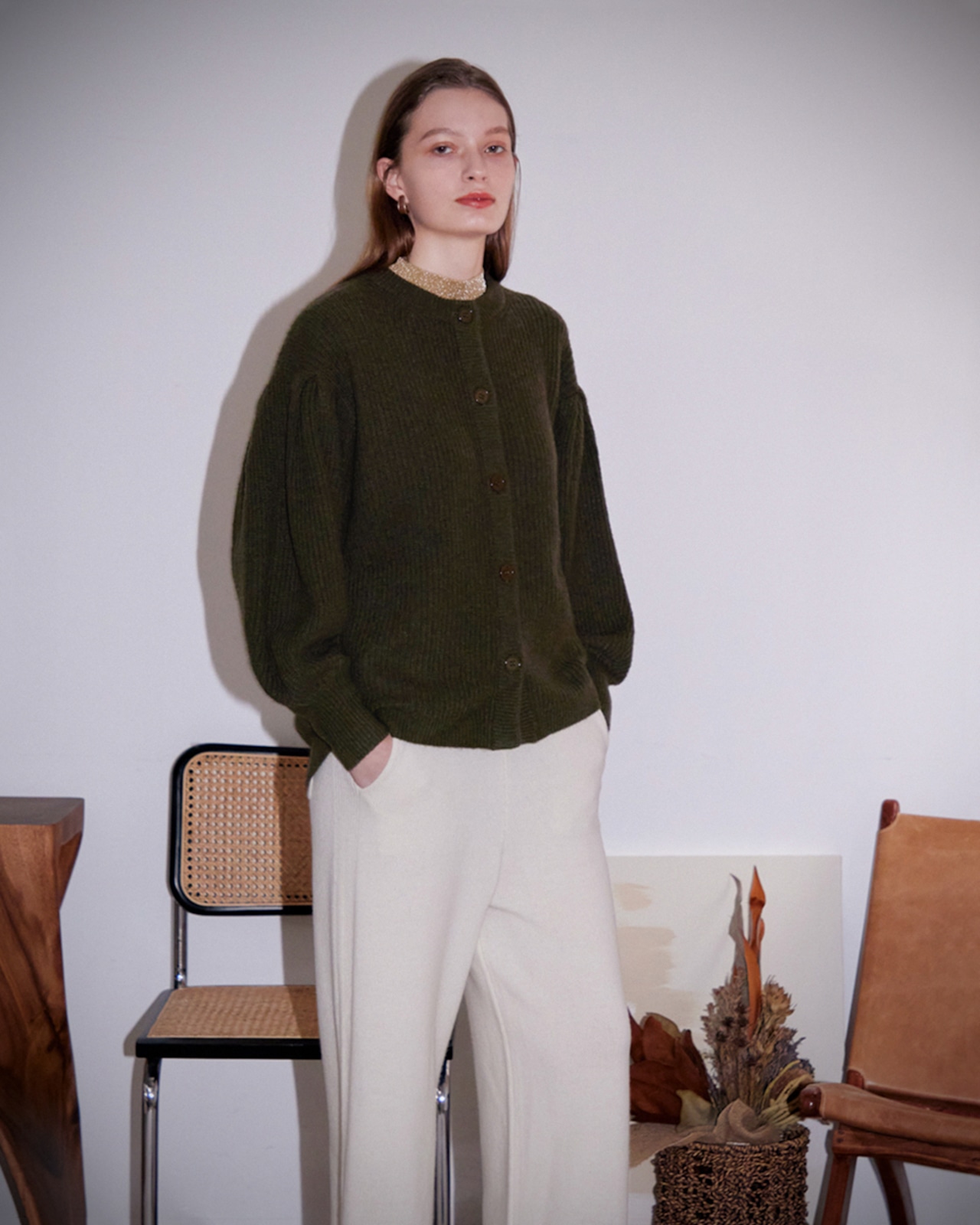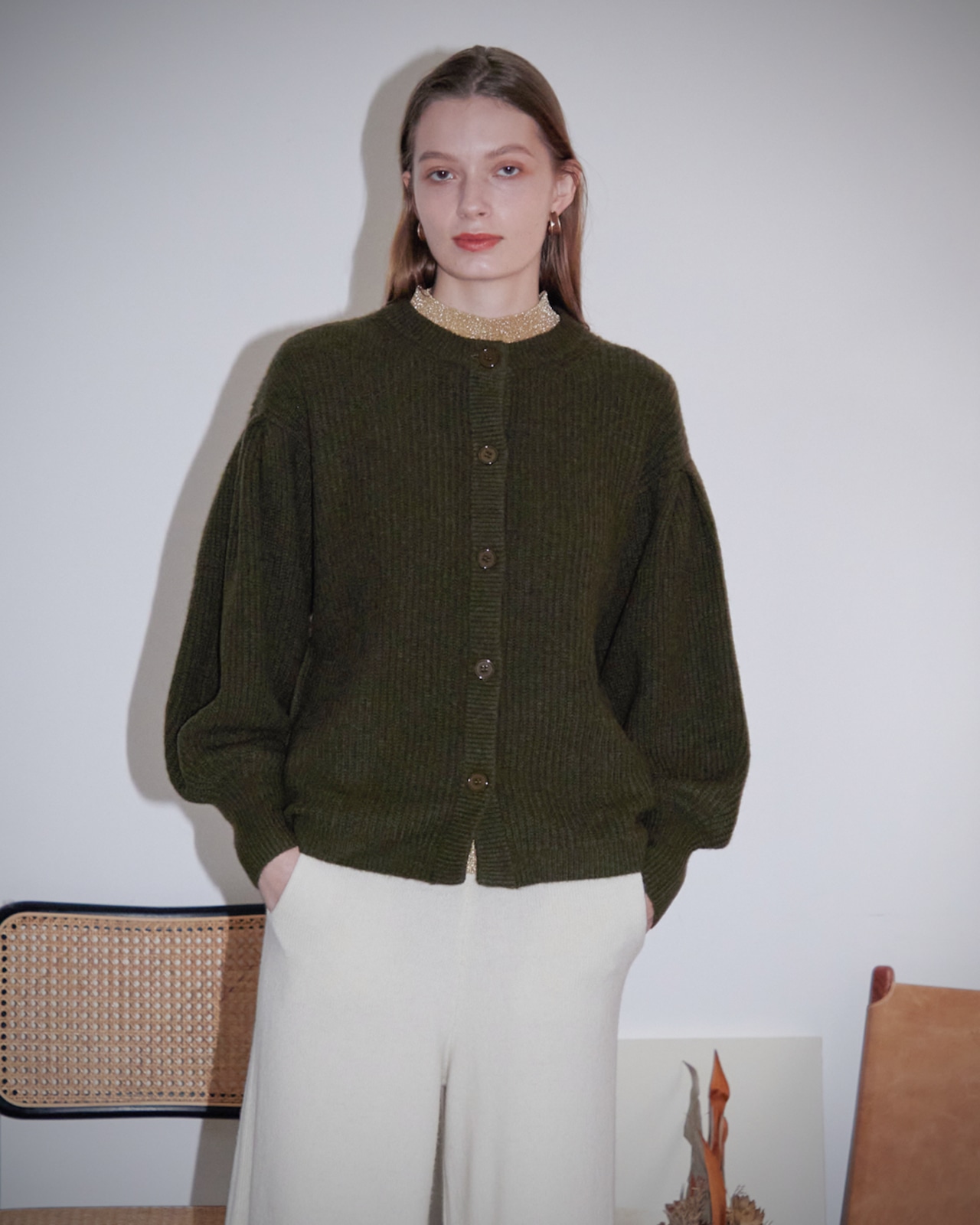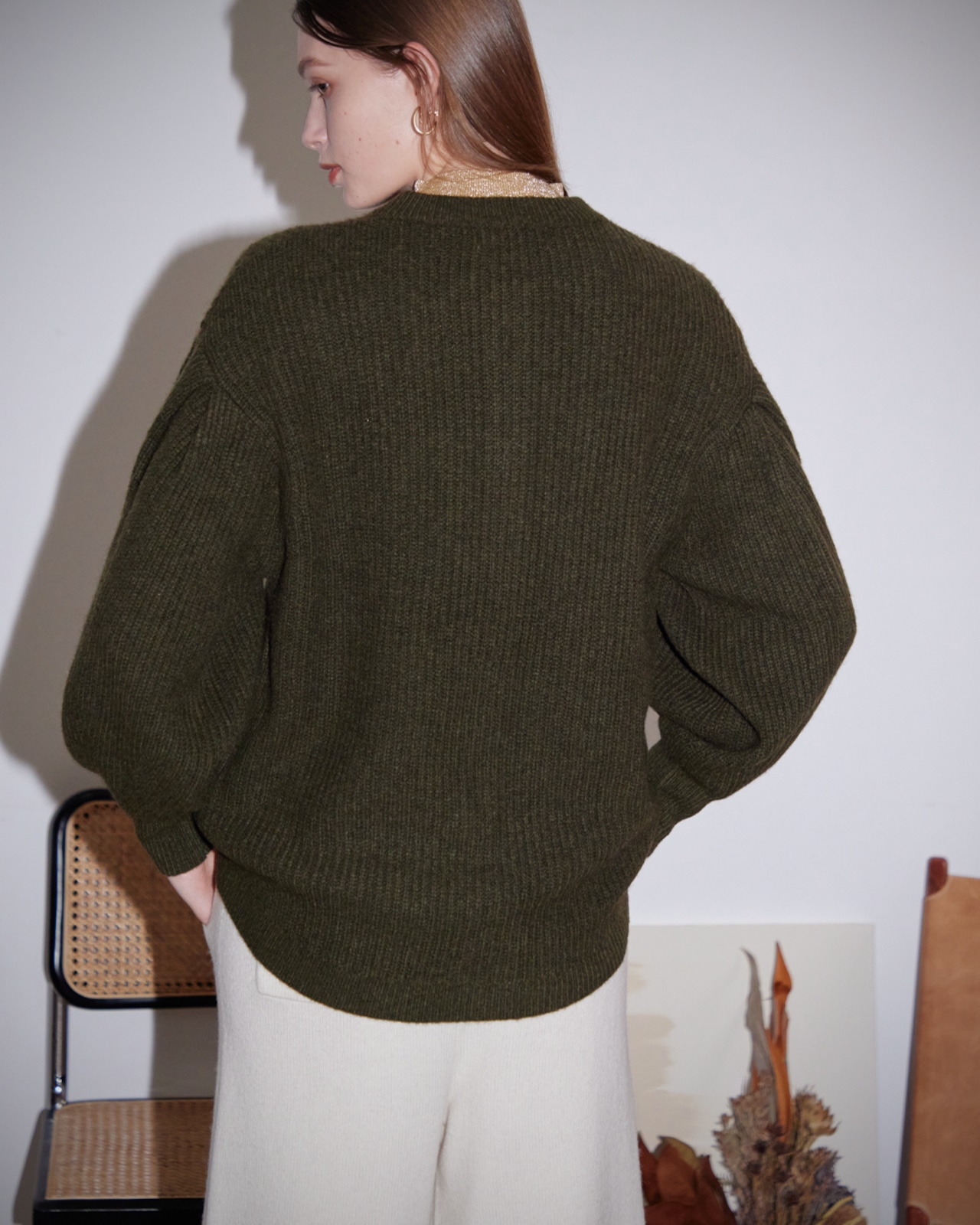 上品な光沢とチクチクしない滑らかな肌触りに仕上げたヤクをブレンドした糸を使用。繊細で非常に細く風を通しにくいため、保温性に優れております。落ち感のあるドロップショルダーと、タックを入れたボリュームのある袖のシルエットが、女性らしさとモードな雰囲気を併せ持つカーディガン。