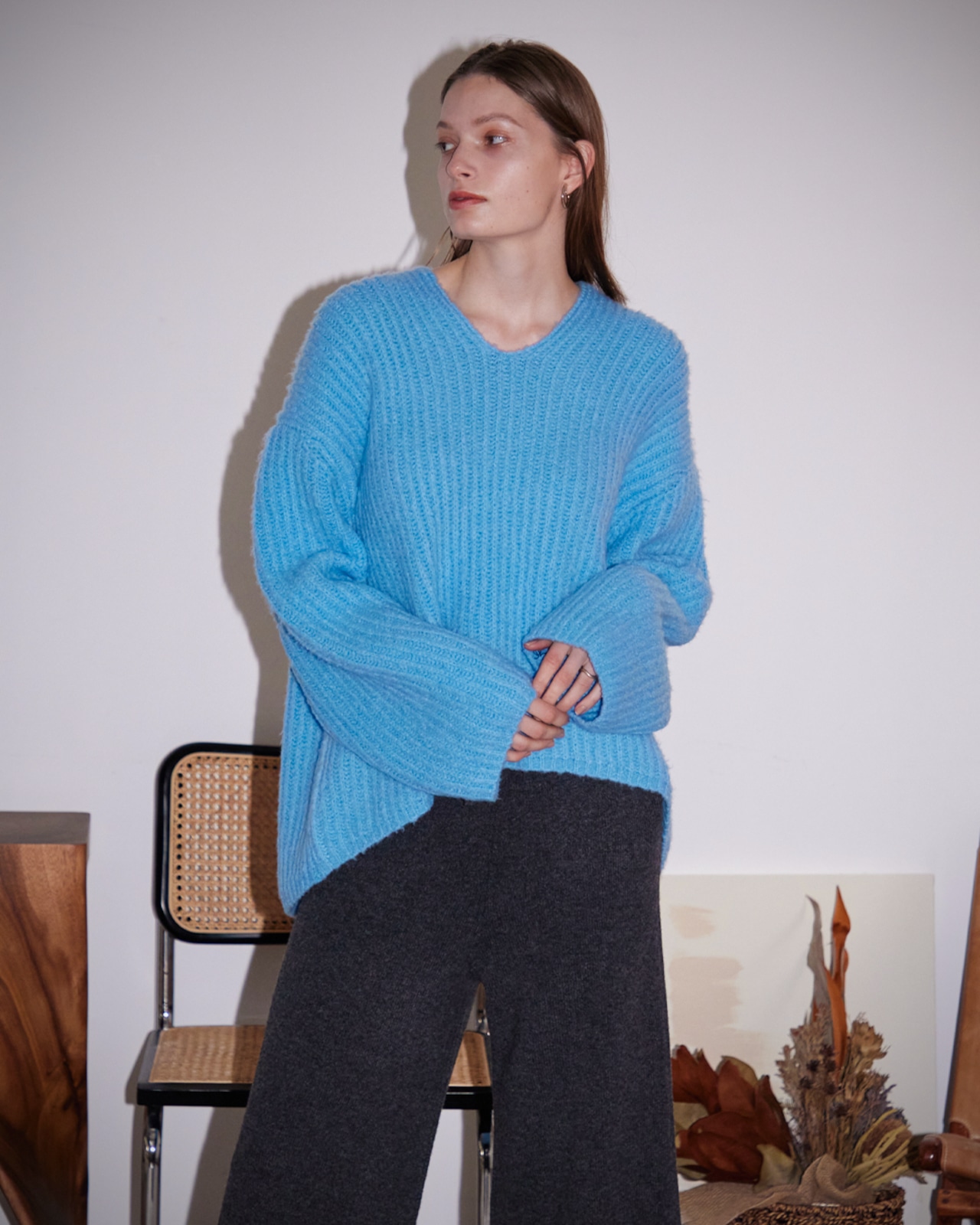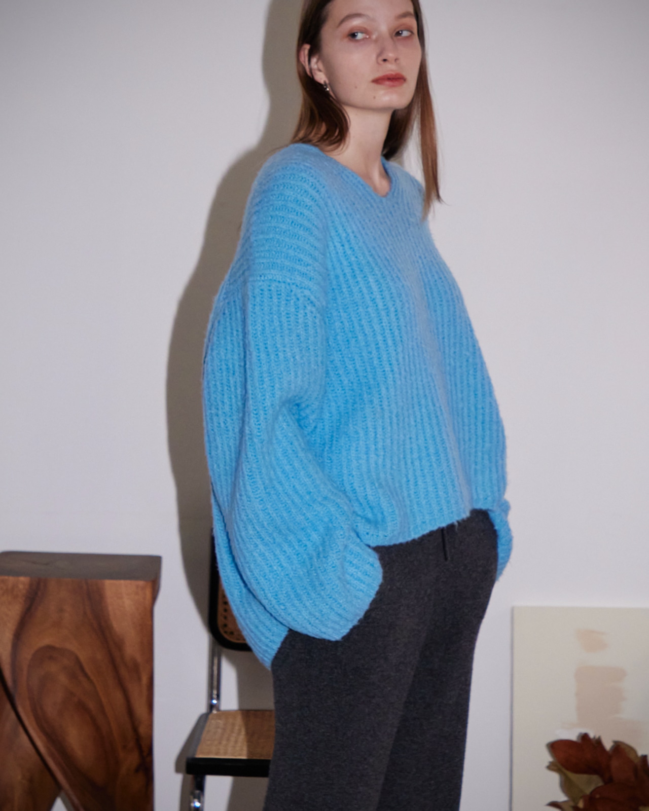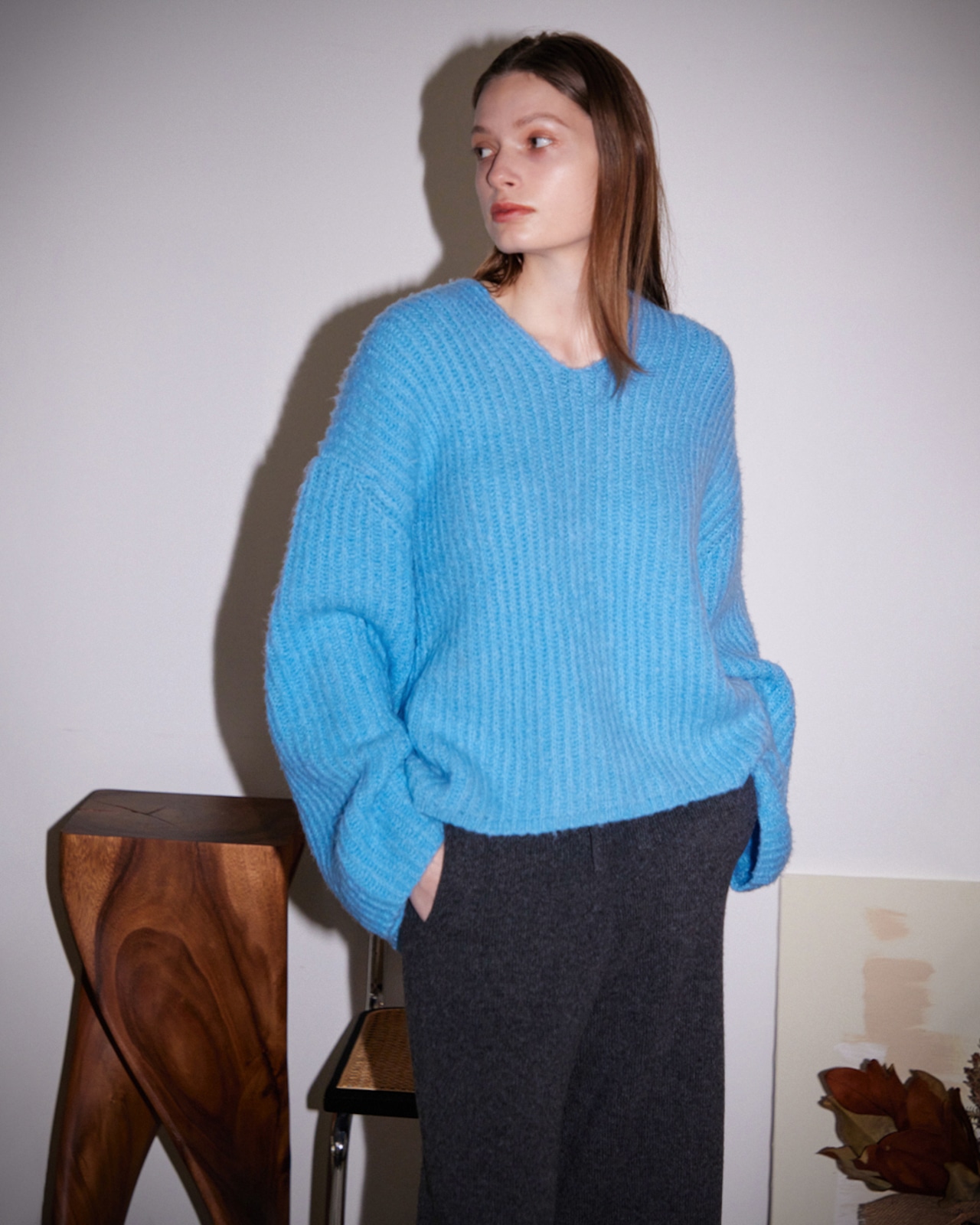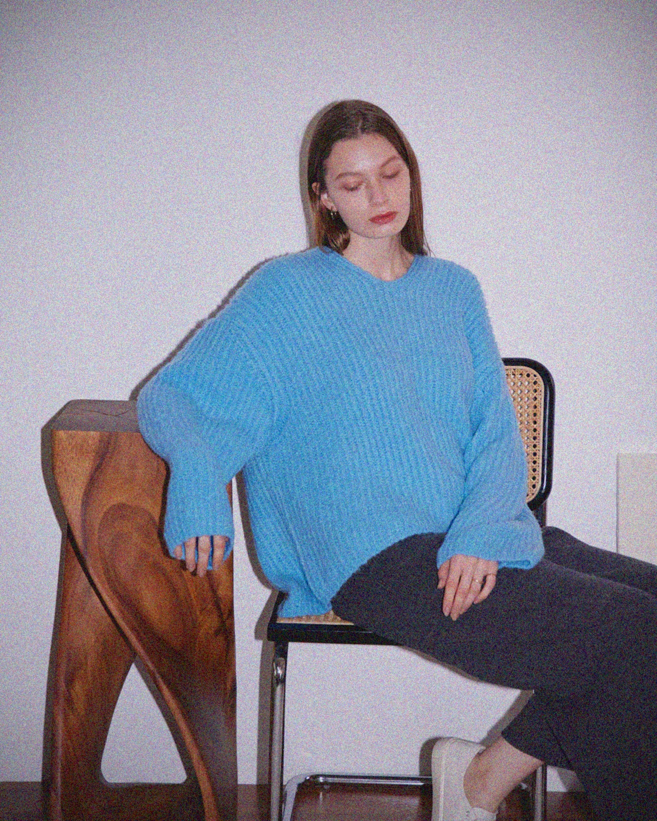 太番手のウール糸を甘捻りすることで、非常に軽くふんわりと膨らみのある表情に仕上げたニット。ナイロン糸をブレンドし保形成を高めました。背面にボリュームの出る丸みのあるコクーンシルエット。鮮やかな色と上質な素材の風合いが目を惹く、コーディネートの主役になる一着。