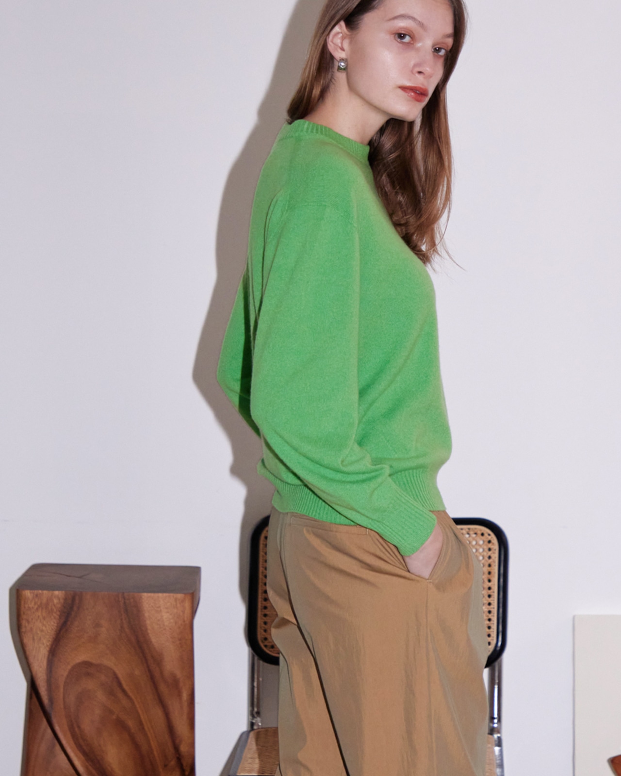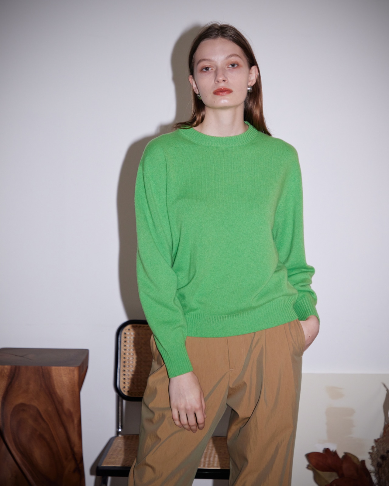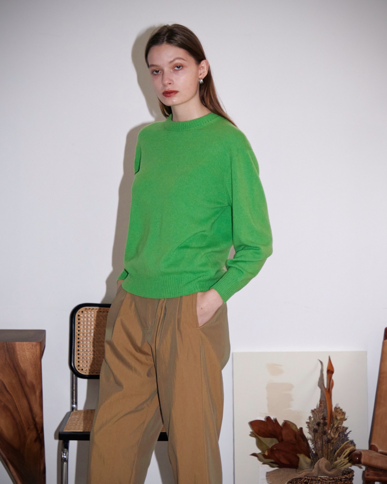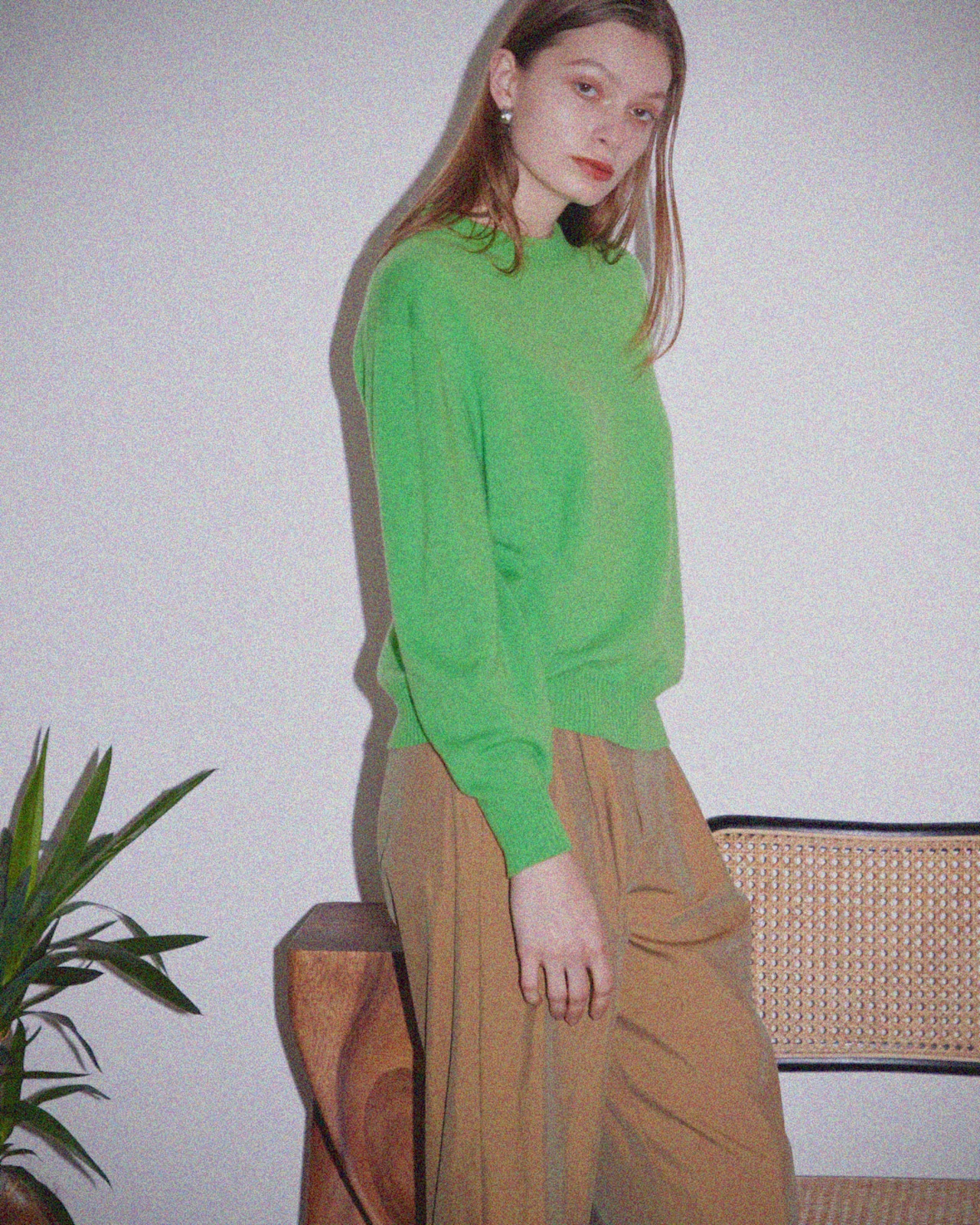 柔らかく保温性と保湿性に優れたカシミヤ糸を使用。ヌメリ感のある優しい肌触りが特徴です。縫い目のないホールガーメント仕様のニット。装飾を極限まで削ぎ落としたミニマルなデザインです。