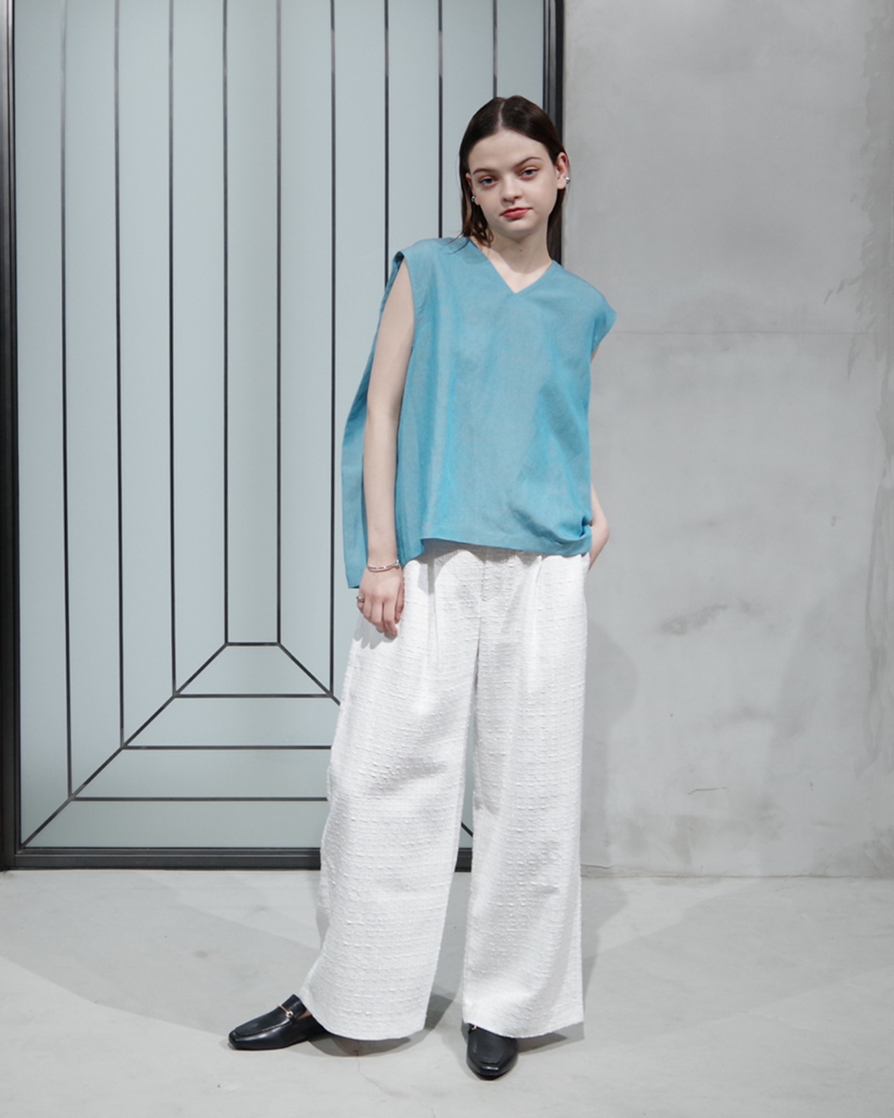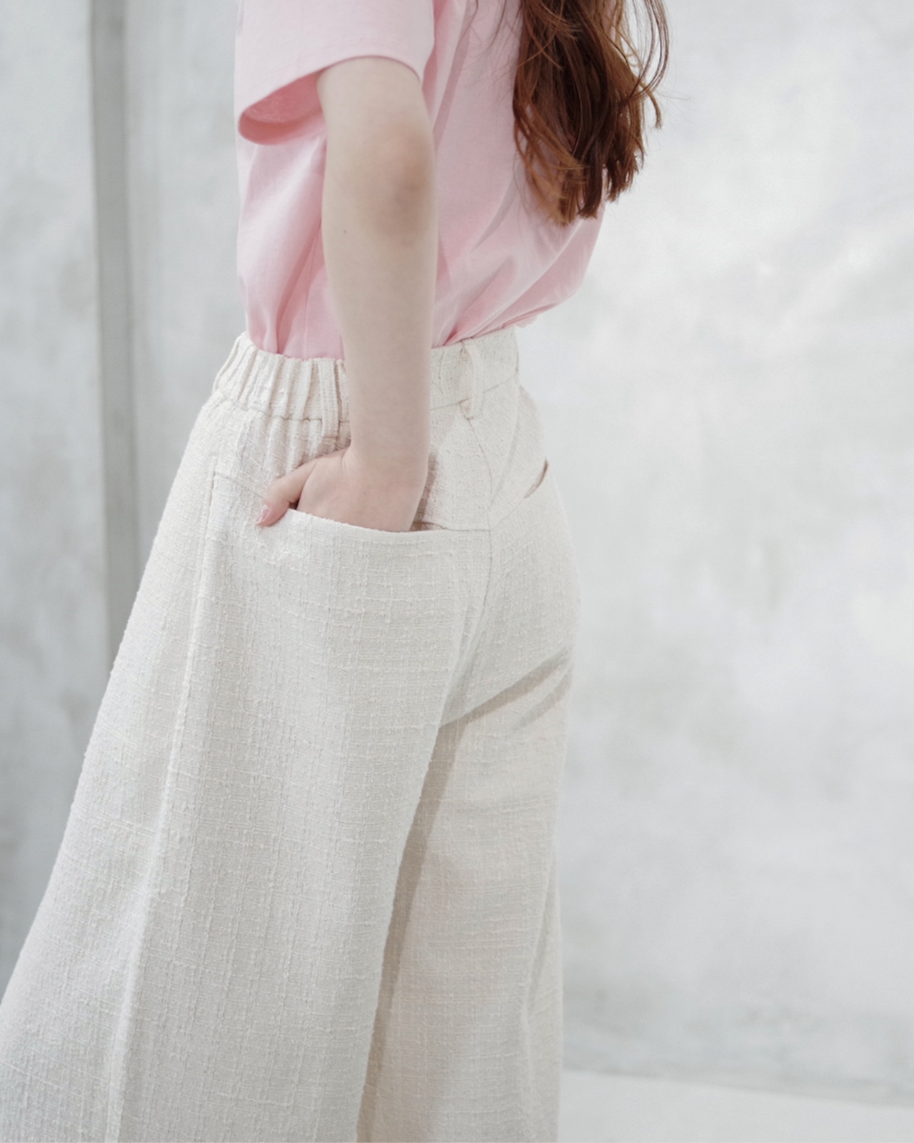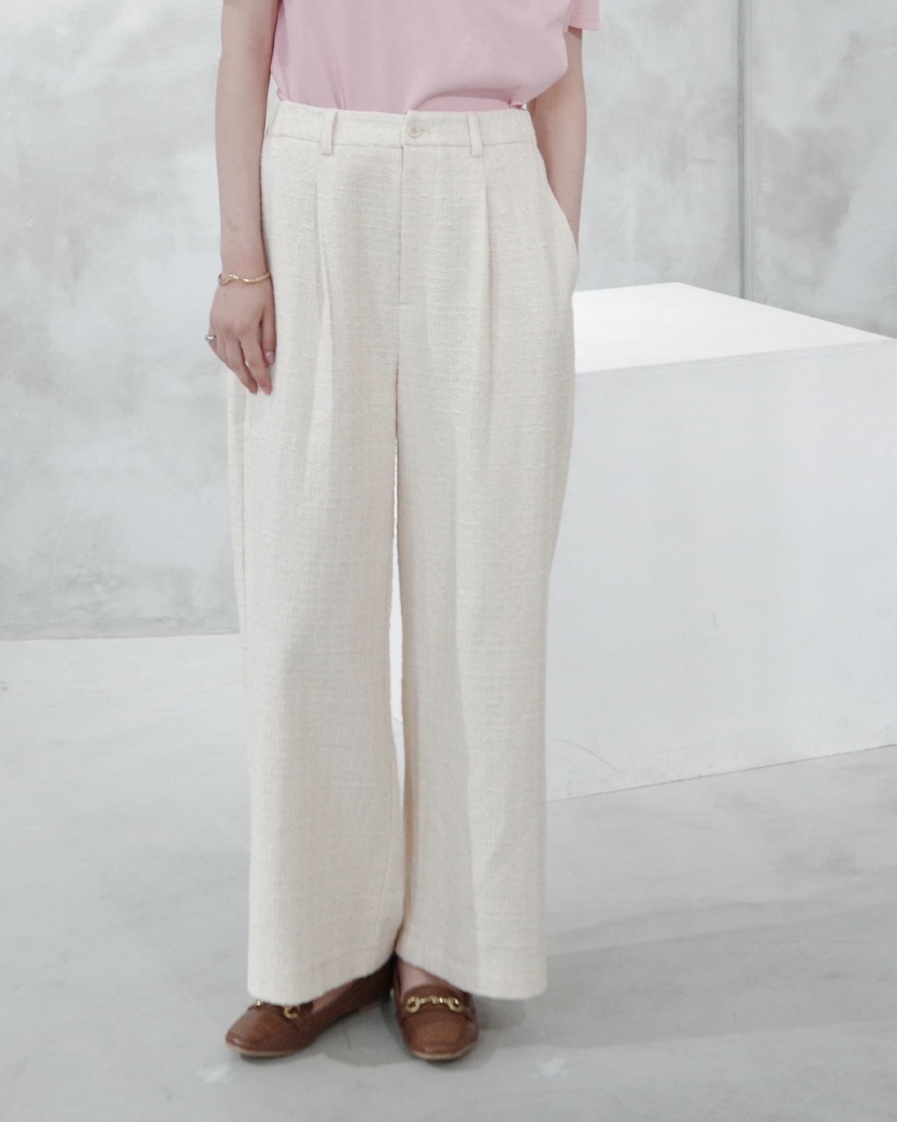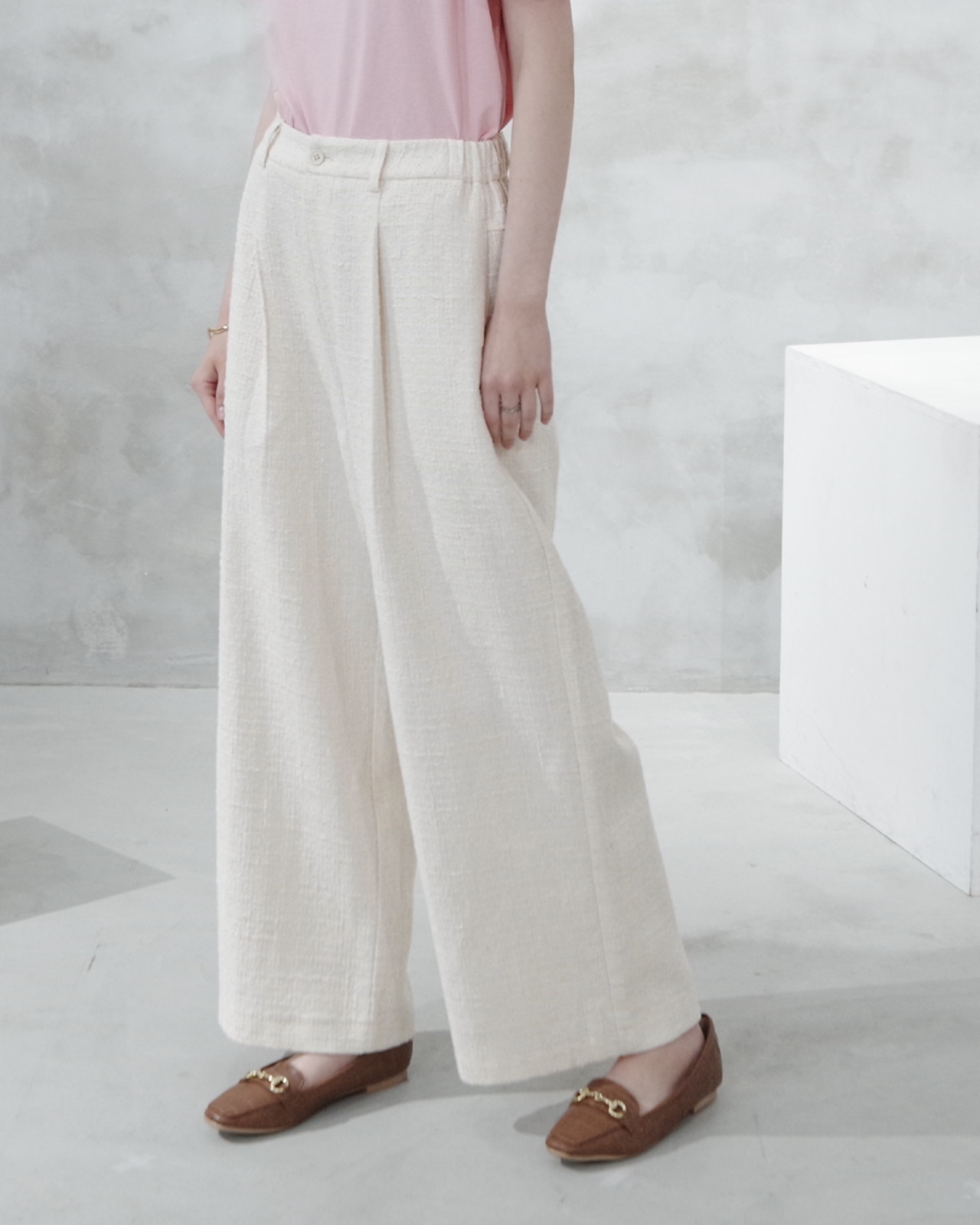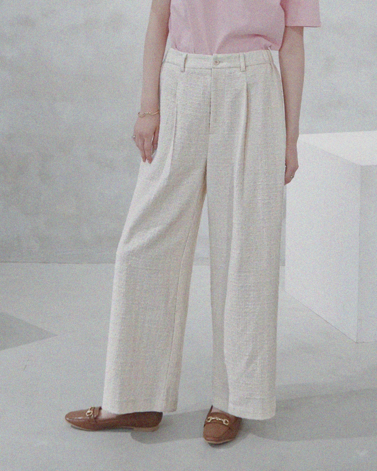 コットンとリネンの天然繊維ならではの上質な風合いが特徴のツイード調の生地を使用。ドライな手触りと肉感のある生地です。フロントにタックを施したワイドストレートのシルエット。ヨークを活かしたヒップポケットは、機能性を備えながらバックスタイルをすっきりとした印象にしてくれます。