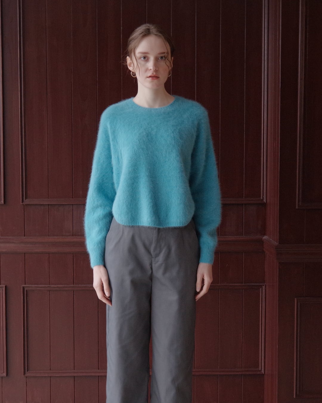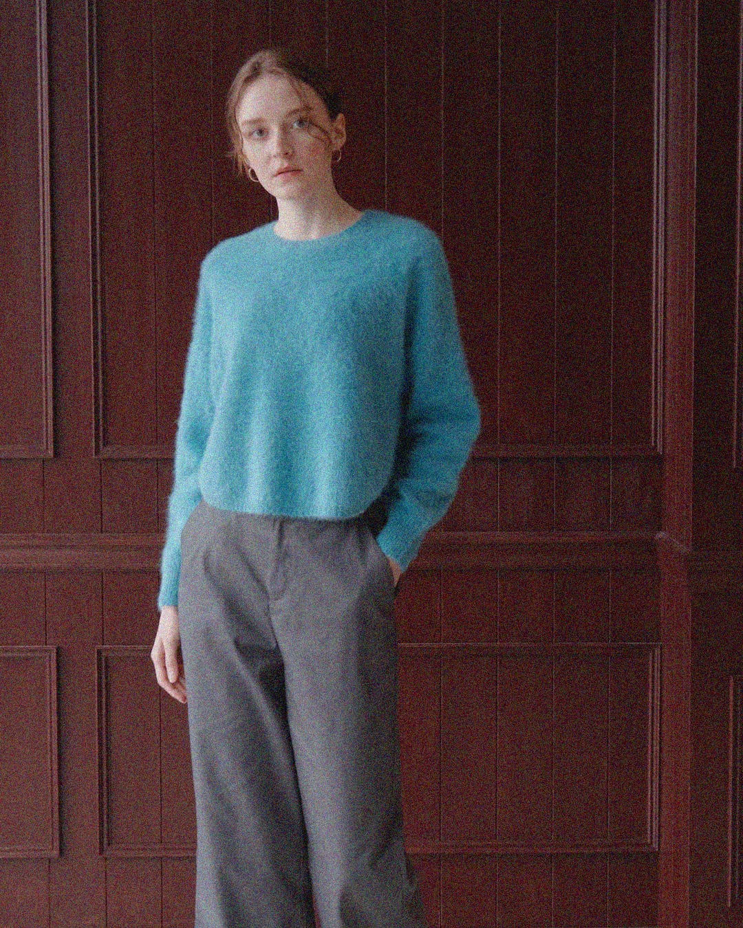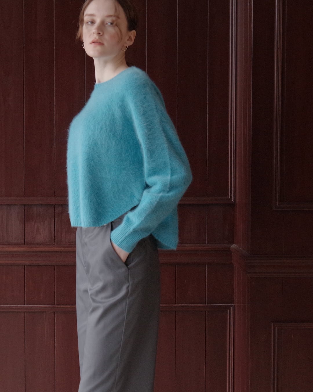 柔らかくふんわりとした風合いのフォックスと、滑らかな肌触りのカシミヤをブレンドした上質な糸を使用。長い毛足は保温性・保湿性に優れ、思わず触れたくなる毛並みの美しさがあります。袖と裾をカーブさせて身幅にゆとりを持たせることで、丸みを帯びたシルエットに仕上げております。